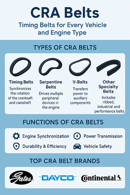 CRA also manufactures ribbed belts, industrial belts, and performance belts for specialized vehicles and machinery. These belts are engineered to meet high-stress and high-performance requirements.